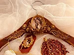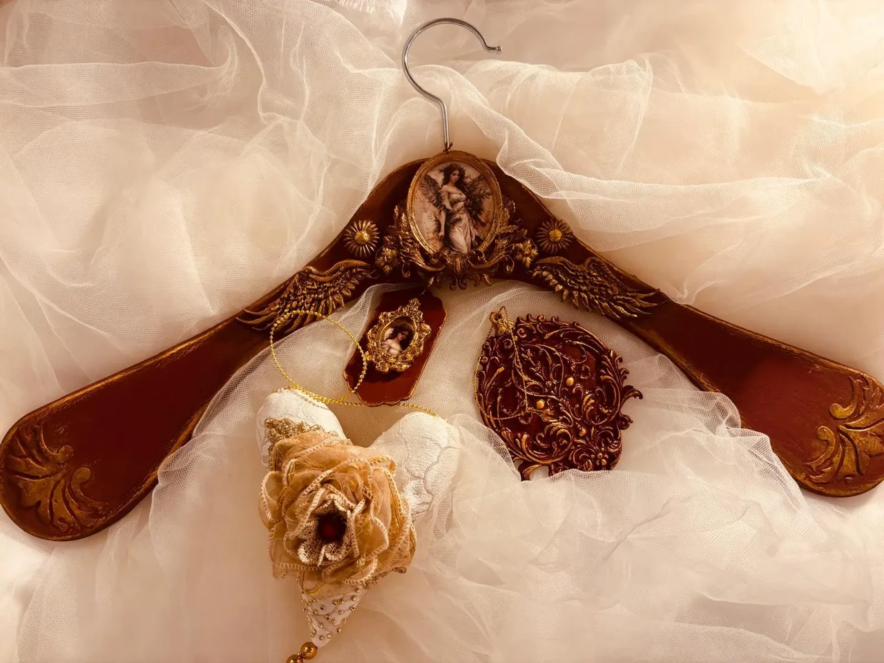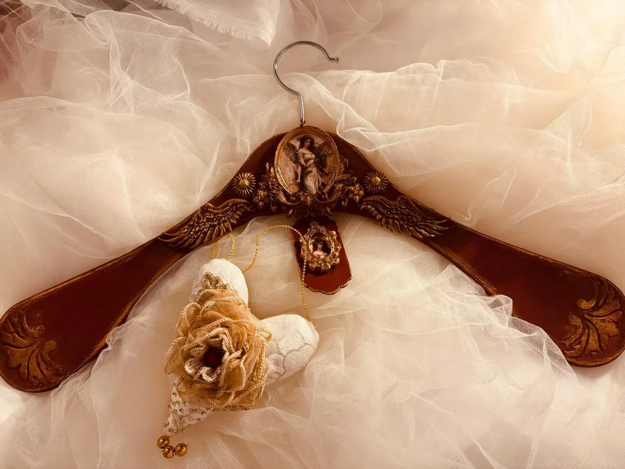 Kuldses raamis pildiga käsitöö riidepuu koos jõulukanistusega
