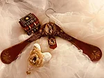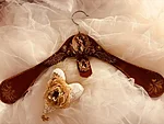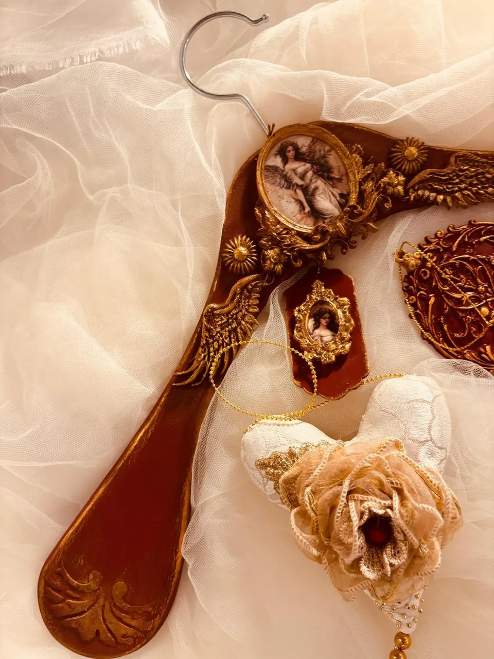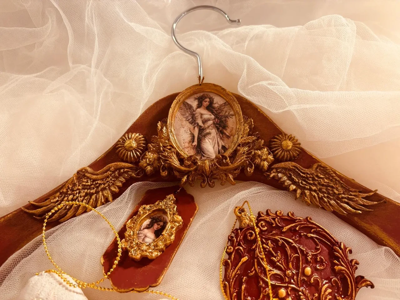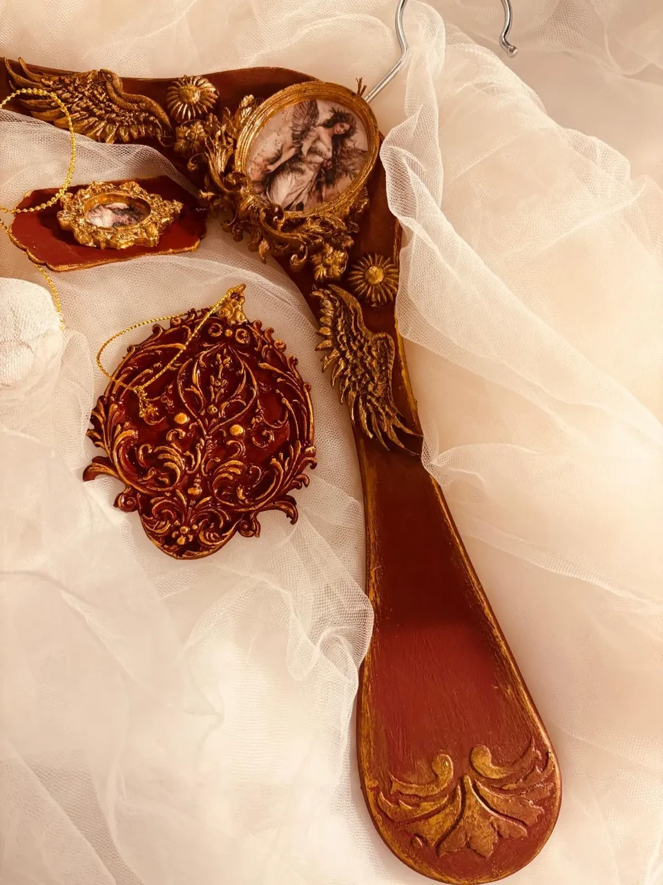 Materjal: kriidivärv, vaha, kahekomponentne vaik, puit. Kõik kaunistused ja raam on kahekomponentsest vaigust. Puidust sildike ja kahekomponentsest vaigust jõuluaunistused tulevad kaasa. Riidepuu mõõdud on 45x23 cm.