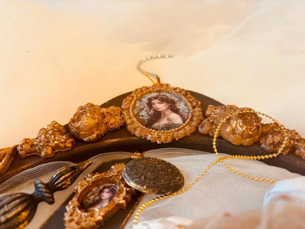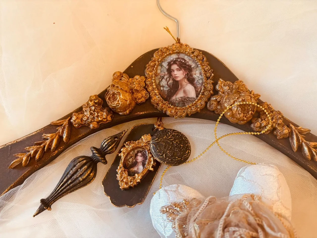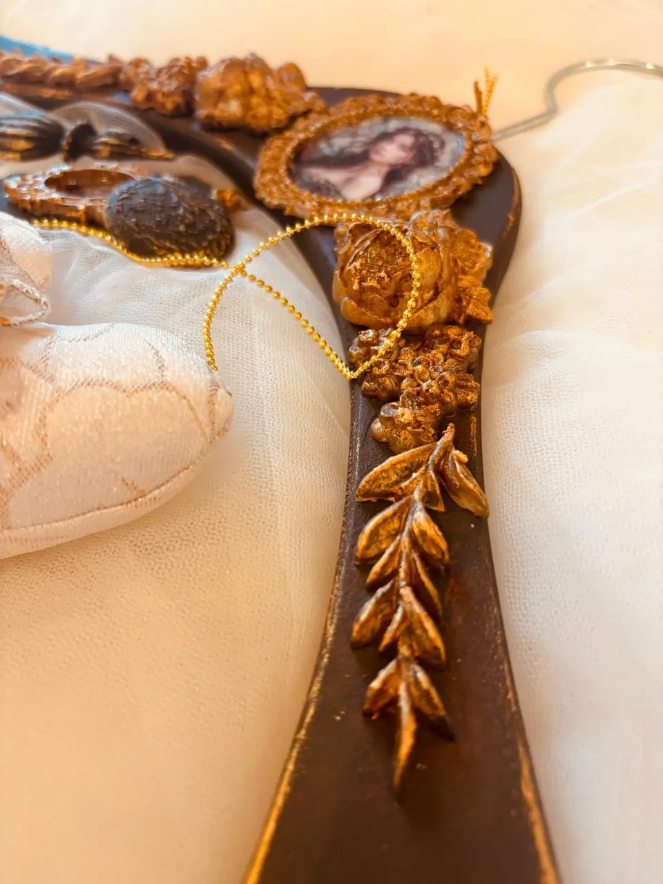 Kuldses raamis pildiga käsitöö riidepuu koos jõulukanistusega