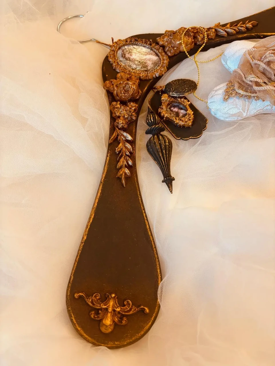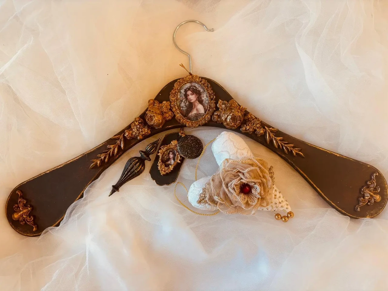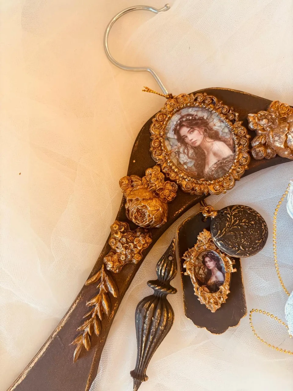 Kuldses raamis pildiga käsitöö riidepuu koos jõulukanistusega
